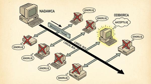 - Oznacza to, że gdy jedno urządzenie nadaje ramkę danych, jest ona odbierana przez **wszystkie** inne urządzenia podłączone do tego samego segmentu sieci.