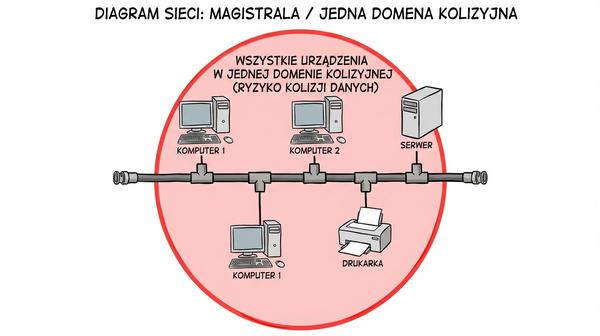 - W klasycznym Ethernecie opartym na topologii magistrali i kablu koncentrycznym, cały segment sieci stanowił jedną, dużą domenę kolizyjną.