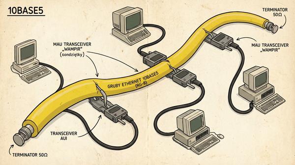- Do podłączania urządzeń używano specjalnych urządzeń zwanych "transceiverami" lub "wampirkami" (vampire taps), które dosłownie przebijały izolację kabla, aby uzyskać dostęp do miedzianego rdzenia.