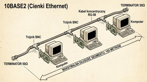 - Następcą 10BASE5 był standard 10BASE2, znany jako "Cienki Ethernet" (Thin Ethernet) lub "Cheapernet".