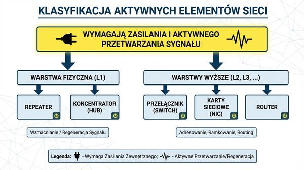 - Elementy aktywne (hub, repeater) wymagają zasilania i przetwarzają sygnał, w przeciwieństwie do pasywnych (kable, złącza).