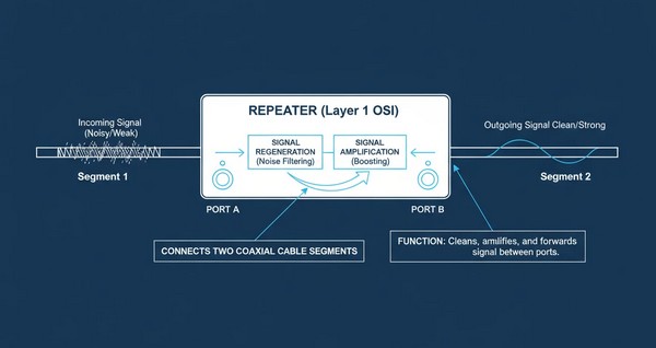 - Pozwalało to na łączenie dwóch segmentów kabla koncentrycznego i tworzenie dłuższych sieci, ale nie rozwiązywało problemu kolizji – wręcz przeciwnie, powiększało domenę kolizyjną.