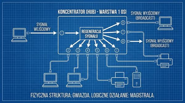 - Mimo fizycznego wyglądu gwiazdy, sieć z hubem wciąż działała jak logiczna magistrala – wszystkie podłączone do niego urządzenia tworzyły jedną, wspólną domenę kolizyjną.