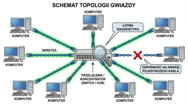 - W tym modelu każde urządzenie końcowe (komputer, drukarka) jest połączone osobnym kablem z centralnym punktem dystrybucyjnym – hubem lub switchem.