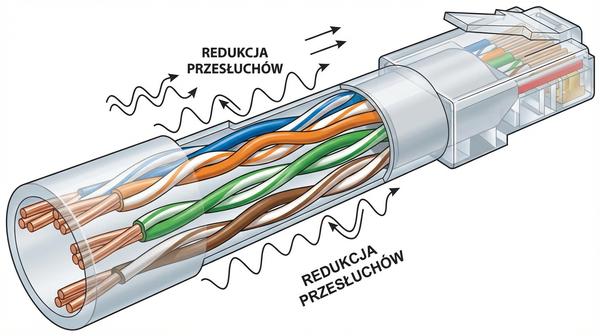 - Skręcenie przewodów w parze nie jest przypadkowe – ma na celu redukcję zakłóceń elektromagnetycznych (tzw. przesłuchów).