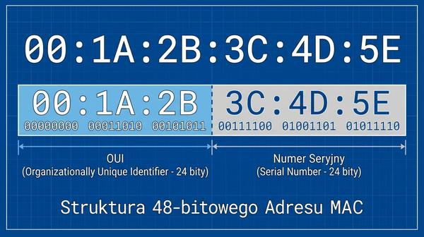 - Adres ten jest zapisywany w systemie szesnastkowym, np. `00:1A:2B:3C:4D:5E`.