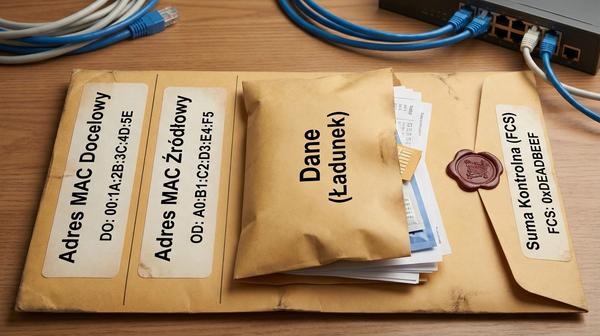 - Dane w sieci Ethernet nie są przesyłane w sposób ciągły, lecz są dzielone na mniejsze porcje, opakowane w struktury zwane **ramkami (frames)**.