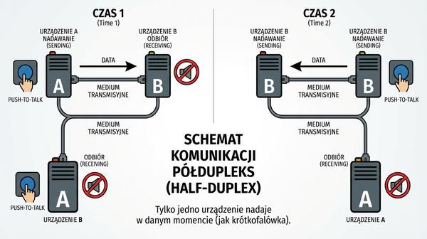 - Oznacza to, że w danym momencie urządzenie może albo nadawać dane, albo je odbierać, ale nigdy nie może robić obu tych rzeczy jednocześnie.