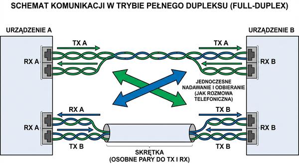 - To jak rozmowa przez telefon – obie strony mogą mówić i słuchać w tym samym czasie, co drastycznie zwiększa efektywną przepustowość.