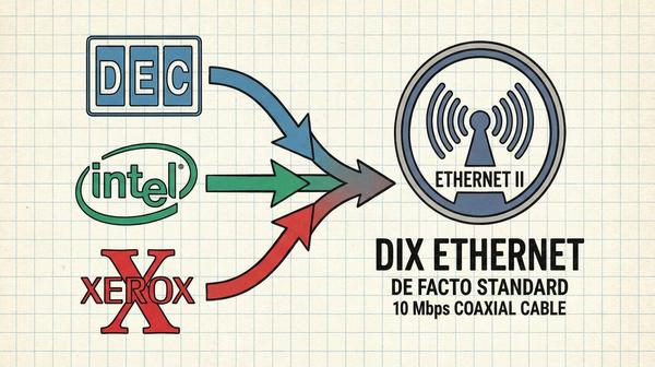 - Standard ten, znany jako **DIX Ethernet** lub Ethernet II, został opublikowany w 1980 roku i stał się podstawą dla przyszłych standardów.