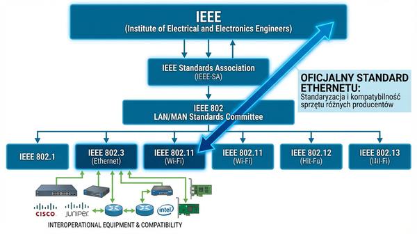 - W 1983 roku organizacja **IEEE (Institute of Electrical and Electronics Engineers)**, odpowiedzialna za tworzenie standardów technicznych, oficjalnie ustandaryzowała Ethernet pod nazwą **IEEE 802.3**.