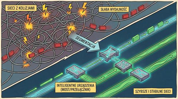 - Inżynierowie zdali sobie sprawę, że kluczem do budowy większych i szybszych sieci jest **segmentacja**, czyli dzielenie dużej sieci na mniejsze, odizolowane od siebie domeny kolizyjne.