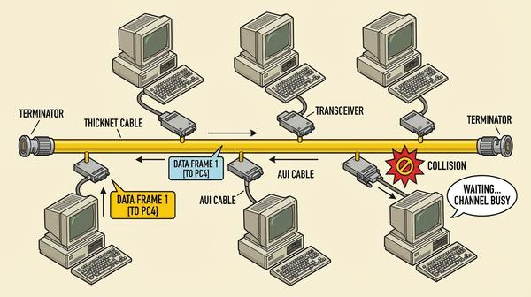 - Ta zasada "jeden nadaje - reszta słucha" jest kluczowa dla zrozumienia działania wczesnego Ethernetu.