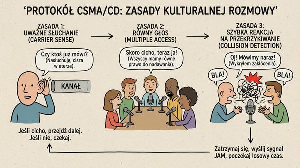 - Carrier Sense (CS): Nasłuchuj, czy ktoś inny nie mówi. Zanim zaczniesz nadawać, sprawdź, czy medium jest wolne.