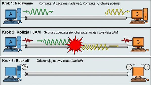 - Oba komputery (A i C) wykrywają kolizję (Collision Detection). Natychmiast przerywają nadawanie i wysyłają krótki sygnał zagłuszający (JAM), aby poinformować wszystkie inne urządzenia o zderzeniu.