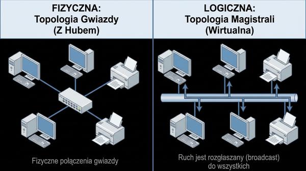 - Co ciekawe, topologia fizyczna i logiczna nie muszą być takie same. We wczesnym Ethernecie obie były topologią magistrali. Dziś najczęściej używamy fizycznej gwiazdy, która logicznie (przy użyciu koncentratora) nadal działa jak magistrala.