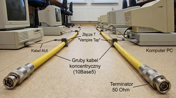 - Zamiast "wampirek", stosowano wspomniane wcześniej złącza BNC i trójniki, które łączyły poszczególne odcinki kabla "od komputera do komputera".