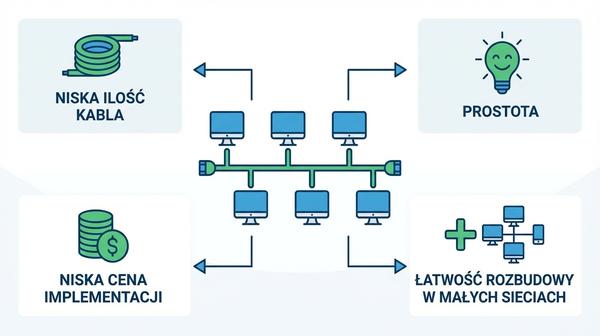 - Wymagała znacznie mniejszej ilości kabla niż, na przykład, topologia gwiazdy, ponieważ nie trzeba było prowadzić osobnego przewodu od każdego komputera do centralnego punktu.