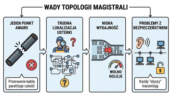 - Niestety, wady topologii magistrali szybko dały o sobie znać wraz ze wzrostem popularności sieci.